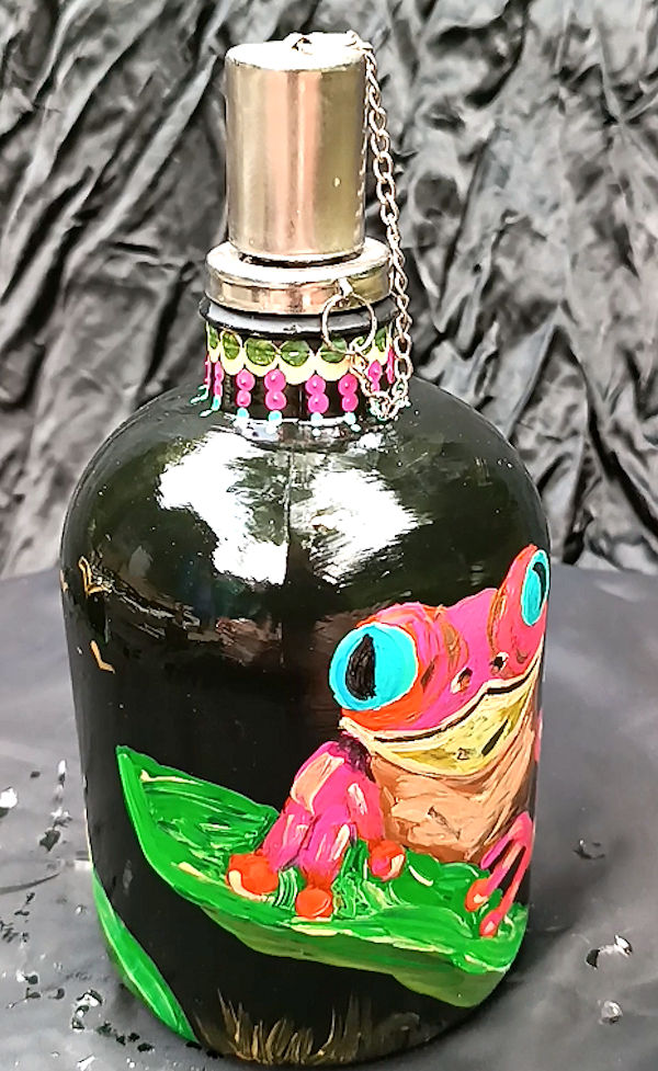 Beschilderde olie lamp met een kikker.[breedte 12 hoogte 22cm]