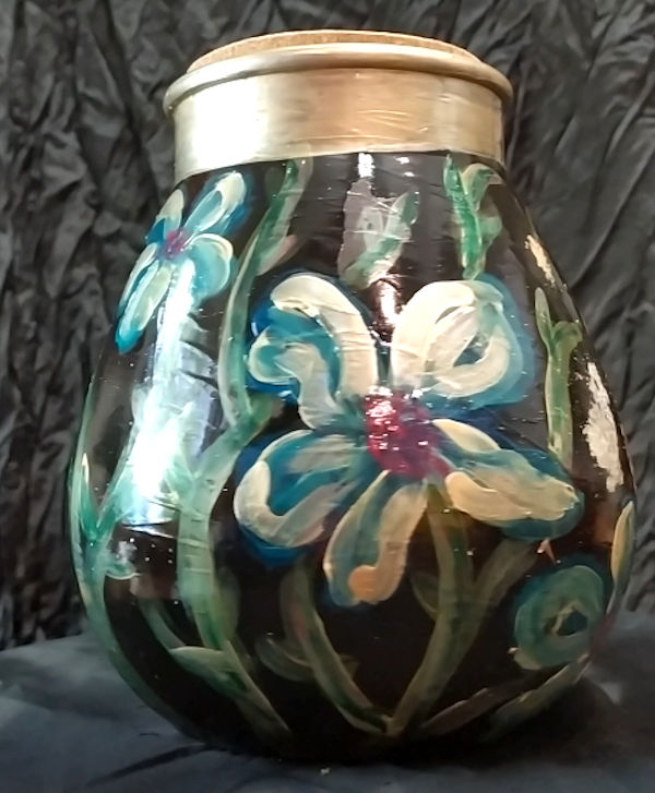 Beschilderde voorraad pot met kurkdeksel afbeelding van bloemen. [hoogte 23 breedte 20 cm]
