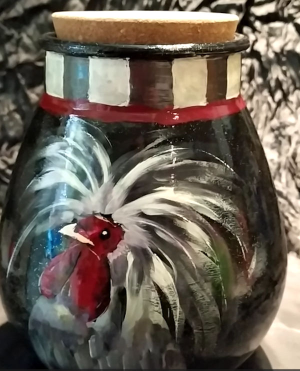 Beschilderde voorraad pot met kurkdeksel. Afbeelding haantjes. [ hoogte 23 breedte 20 cm]