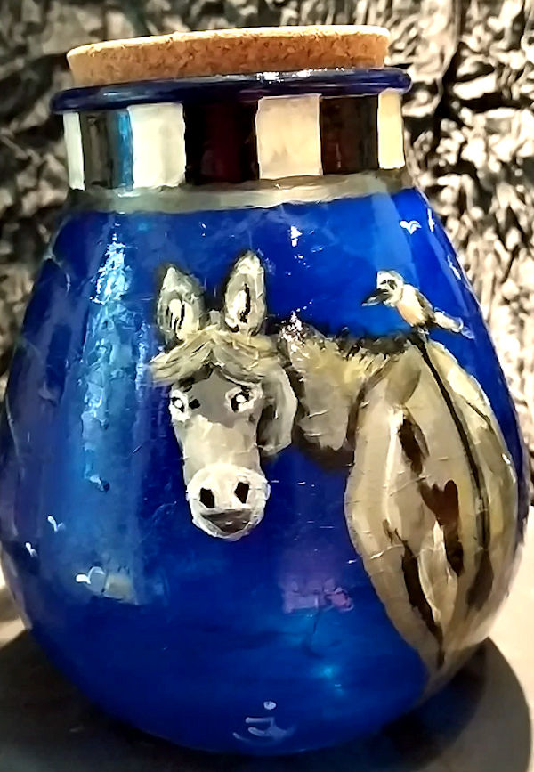 Beschilderde voorraad pot met kurkdeksel . afbeelding ezeltjes. [hoogte 23 breedte 20 cm]