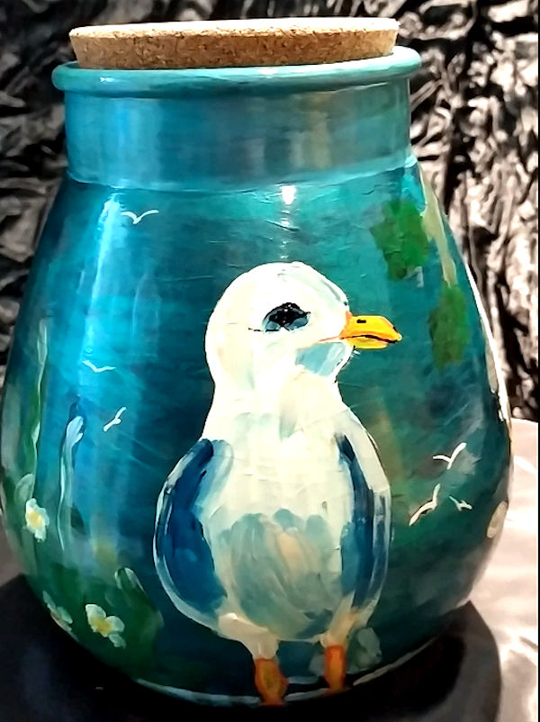 Beschilderde voorraad pot met kurk deksel. Verschillende meeuwen. [ hoogte 23 en breedte 20 cm]